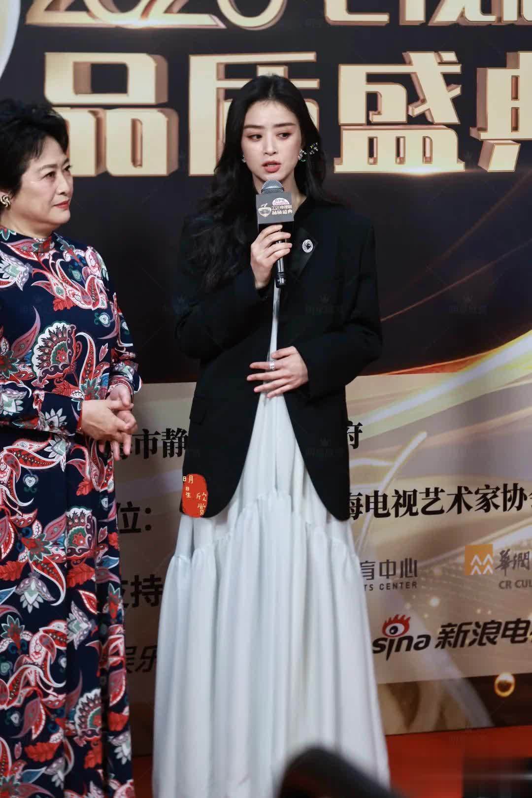 从央视中秋晚会的淡金刺绣长裙,到中国网络视听盛典的粉色国风礼服,再到这次品质盛典的黑白配造型,每一次都在进步,彻底走出了属于自己的时尚路线。